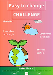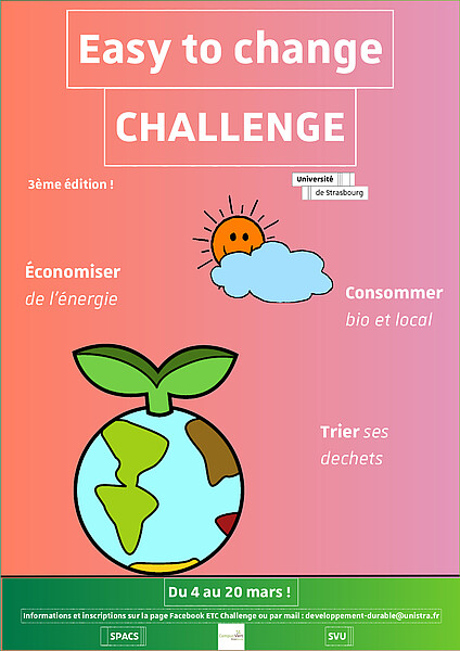 Du 4 au 20 mars, venez relever le défi : grâce à nos gestes du quotidien, il est possible d’agir sur la préservation de l’environnement, tout en faisant des économies d’eau ou d’électricité chez vous et à l’université. Le défi Easy To Change est organisé par la mission Développement durable de l’Université de Strasbourg et l’association Campus Vert, en partenariat avec le Service de la vie universitaire (SVU) et le Service pour la promotion de l'action sociale (Spacs).