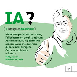 « Intéressé par le droit européen, j’ai logiquement choisi Strasbourg. Après mes cours, je peux même assister aux séances plénières du Parlement européen. C’est une expérience unique ! ». Comme Taha, étudiant en Droit, tous les étudiants de l'Université de Strasbourg évoluent dans un environnement à la pointe de la recherche et de la construction des savoirs. IA comme Intelligence Académique.