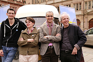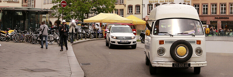 Claire Audhuy et son compagnon de route, Baptiste Cogitore, sont partis ce samedi 10 mai (jour de la fête de l’Europe) de la place Gutenberg à Strasbourg pour un voyage de cinq mois à travers l’est de l’Europe. L'Université de Strasbourg, partenaire de ce projet au travers du label Initiative d'excellence, était représentée par le président Alain Beretz et le vice-président Sciences en société, Edouard Mehl.