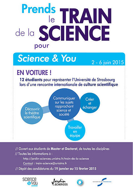 Le Jardin des sciences de l’Université invite les étudiants en master et les doctorants à postuler pour monter dans le Train de la science, destination l’événement international de culture scientifique Science & You, à Nancy du 2 au 6 juin 2015.