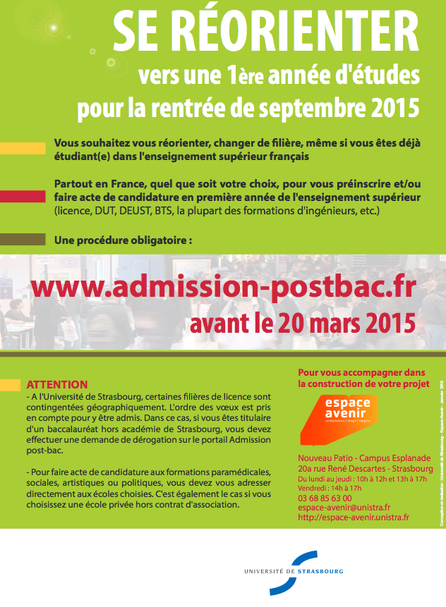L'Espace avenir de l'université vous accompagne dans la construction de votre projet : réorientation ou inscription dans une première année d'études dans l'enseignement supérieur (licence, DUT, BTS, CPGE, etc.).