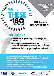 L’édition alsacienne du concours Ma thèse en 180 secondes est ouverte à tous les doctorants, toutes disciplines confondues, appartenant à l’Université de Strasbourg et de Haute Alsace. Les inscriptions pour participer à ce concours se font en ligne, du 7 décembre 2015 au 3 février 2016.
