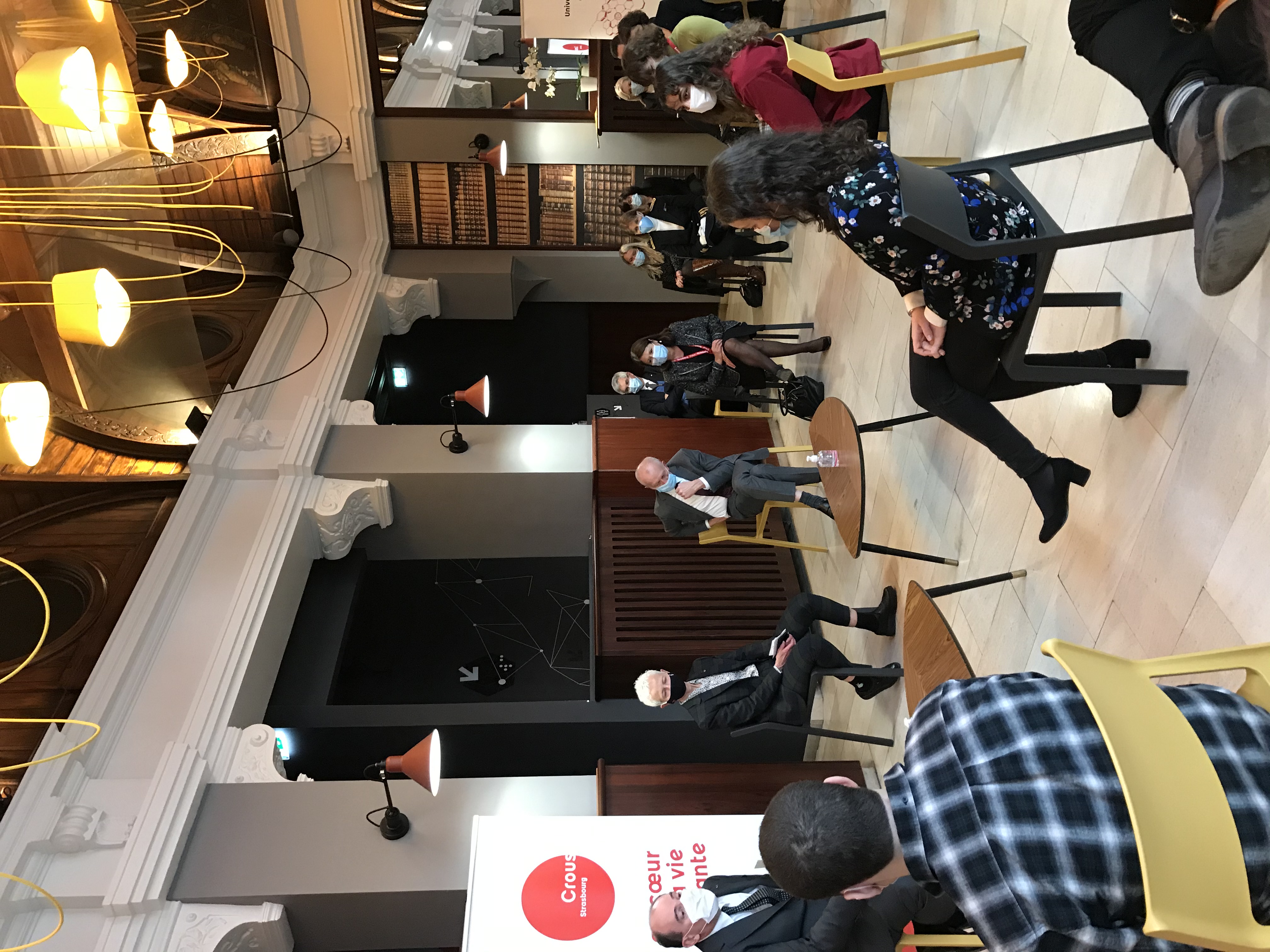 Des notes d’espoir, il y en a surtout eu lorsqu’ont été égrenés les mesures et dispositifs d’aide mis en place par une foule d’acteurs universitaires. « Soutien psychologique du Service de santé universitaire, repas à 1 €, étudiants relais campus et cité, prêts et dons d’ordinateurs, bourses, distributions alimentaires et autres formes d’aides de l’Association fédérative générale des étudiants de Strasbourg (Afges)… » ont été cités par Alban, Frédéric, Gauthier, Jade, Mohammed et Justine, étudiants aidants et aidés, lors d’une prise de parole orchestrée par Thomas Heckel, directeur adjoint de la Fondation Université de Strasbourg. Un acteur essentiel de la chaîne de solidarité, tout comme le Crous, représenté par sa directrice, Lina Rustom : « L’argent récolté par notre appel à don au profit des étudiants a pu être distribué par ce dernier, grâce à la connaissance de terrain de ses assistantes sociales », a rappelé Thomas Heckel. Grégoire Gall, étudiant en quatrième année de médecine et président de l’Amicale de médecine, a rappelé l’engagement sans faille des étudiants en santé pendant la crise, tous niveaux confondus.