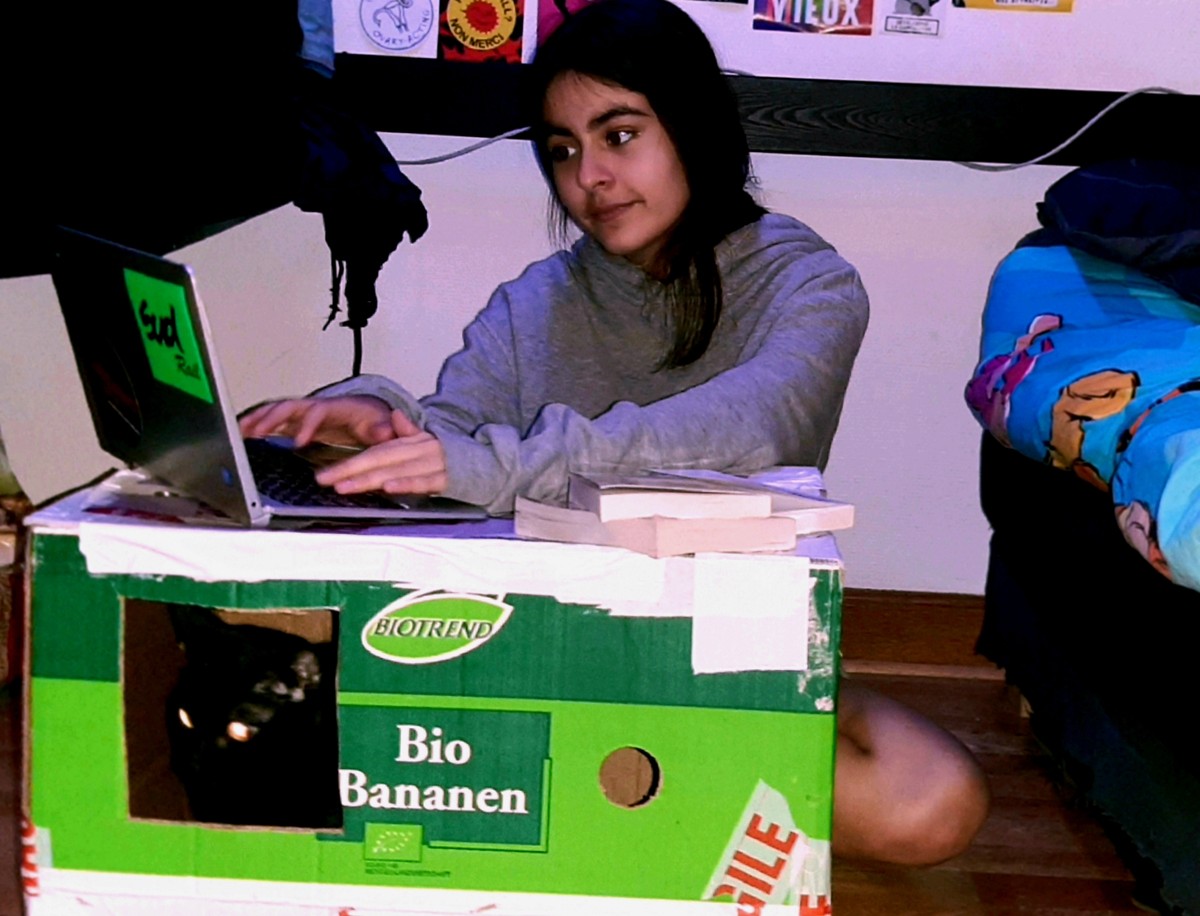 Cependant, travailler dans ces conditions est assez difficile car je n'ai pas un espace de travail où m'isoler pour suivre mes cours et passer mes examens. Normalement je travaille en bibliothèque mais elles sont toutes fermées dû au confinement. Pour l'instant avec mon copain on partage tour à tour le bureau et la chaise qu'on a, tandis que l'autre essaie de travailler par terre ou sur le canapé.