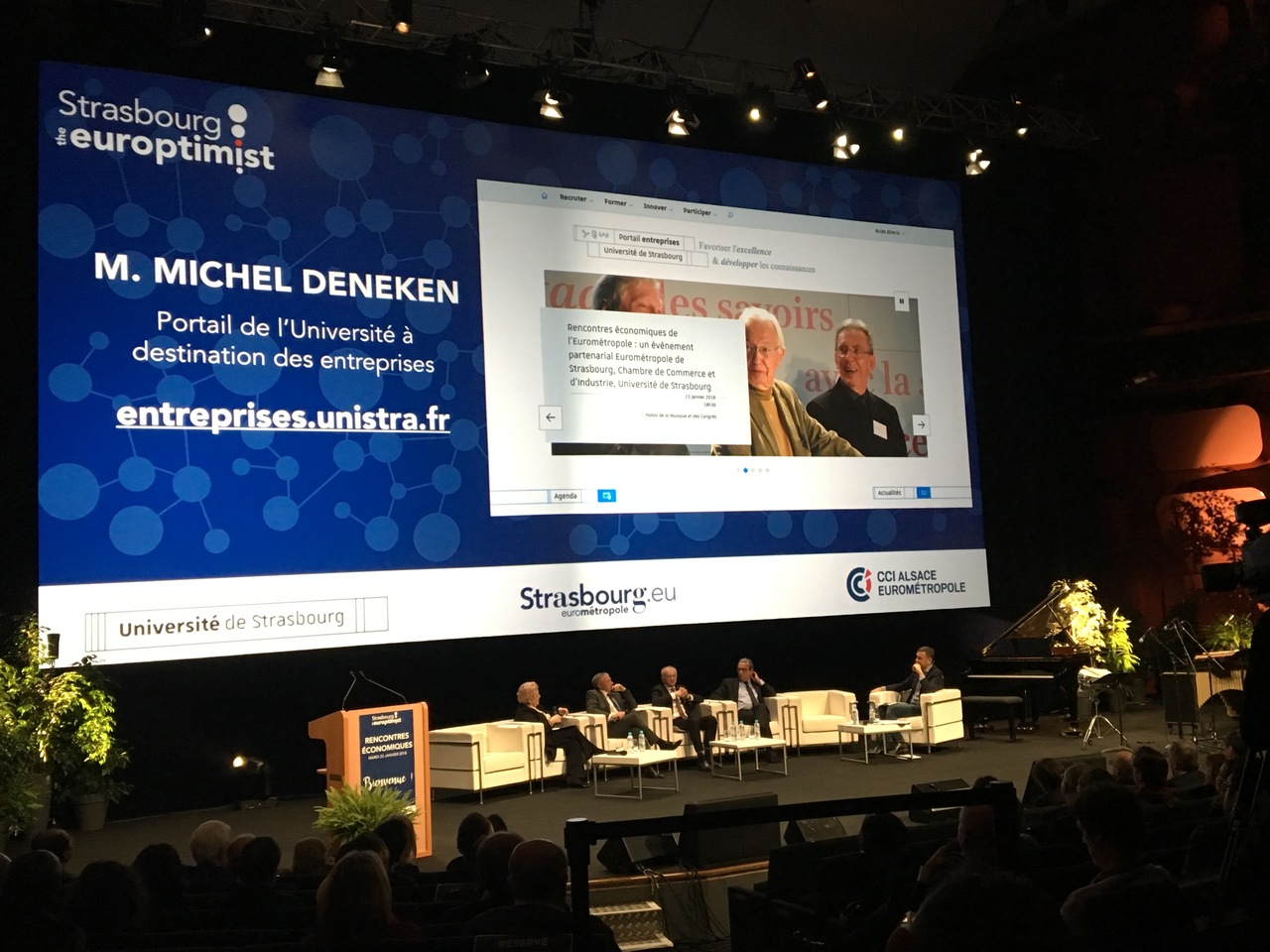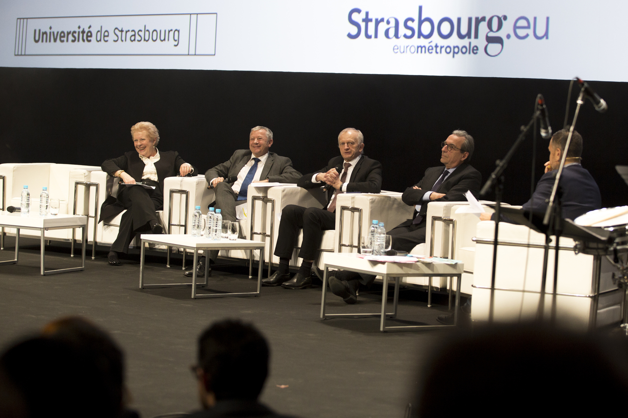 Jean-Pierre Sauvage, Jean-Marie Lehn et Jules Hoffmann, trois des quatre prix Nobel en activité à l’Université de Strasbourg, étaient les invités de marque de la traditionnelle soirée des vœux au monde économique organisée en partenariat avec la Chambre de commerce et d’industrie (CCI) Alsace et l’Eurométropole. Plus généralement, c’est la recherche et les liens entre université et entreprise qui étaient mis à l’honneur lors de la soirée.