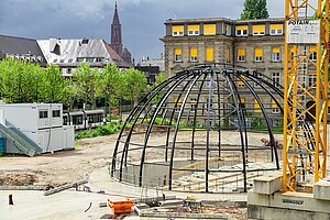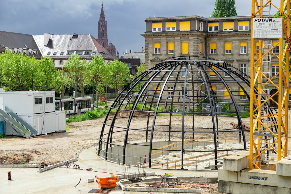 L’installation du dôme est symbolique : il permettra de suspendre l’écran qui fera vivre au public l’expérience d’un voyage dans l’Univers, grâce à la projection de la voûte étoilée par le biais d’un simulateur astronomique. C’est aussi l’une des premières structures du bâtiment qui témoigne du parti-pris architectural : la construction d’un volume arrondi, bientôt revêtu d’une forme conique, qui entre en résonnance avec les édifices classiques qui l’entourent. Enfin, ce dôme représente un défi de construction devant allier à la fois esthétisme et contraintes techniques liées à l’usage du bâtiment.