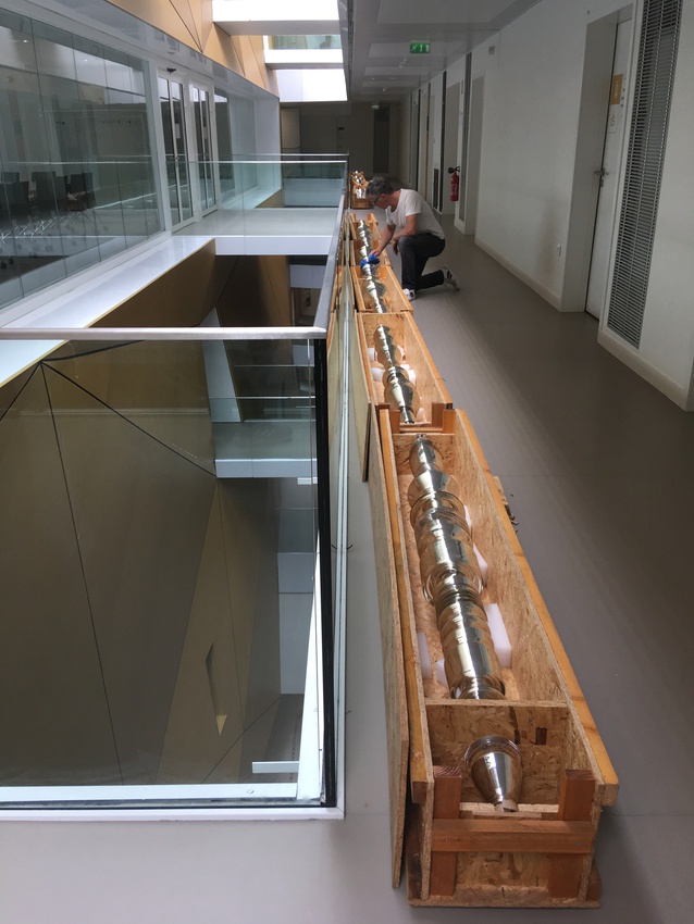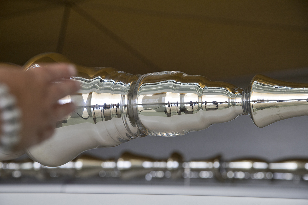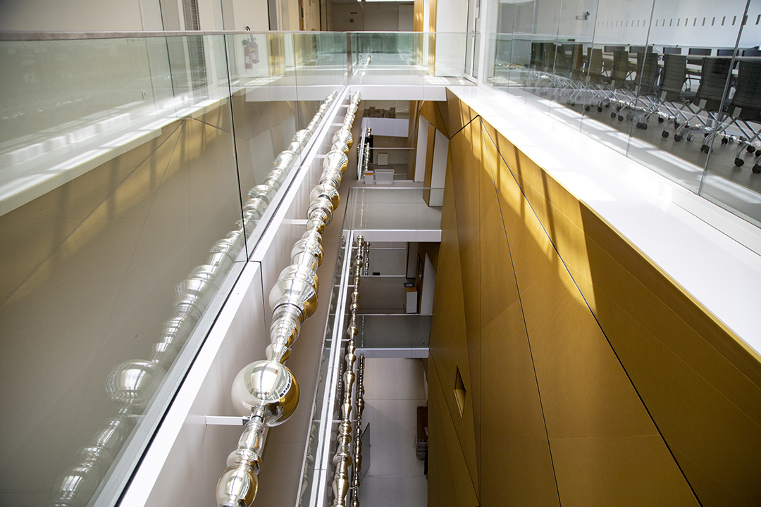 Les formes qu’elle a conçues ont ensuite été soufflées à la bouche par les artisans verriers de Meisenthal, l’argenture vernissée qui en tapisse l’intérieur réalisée par l’entreprise locale Verrisima, explique l’artiste qui a à cœur « de ne pas travailler hors-sol », et s’est aussi entourée d’ingénieurs et d’artisans métalliers pour la conception pratique et l’installation de l’œuvre. Plus récemment, elle a réalisé un autre projet « 1% artistique » pour la Maison des sciences de l’Homme, à Rennes, cette fois-ci avec des tailleurs de pierre.