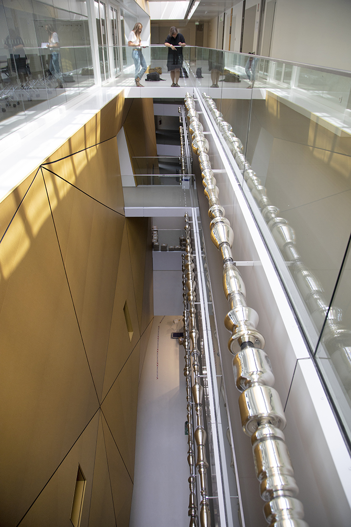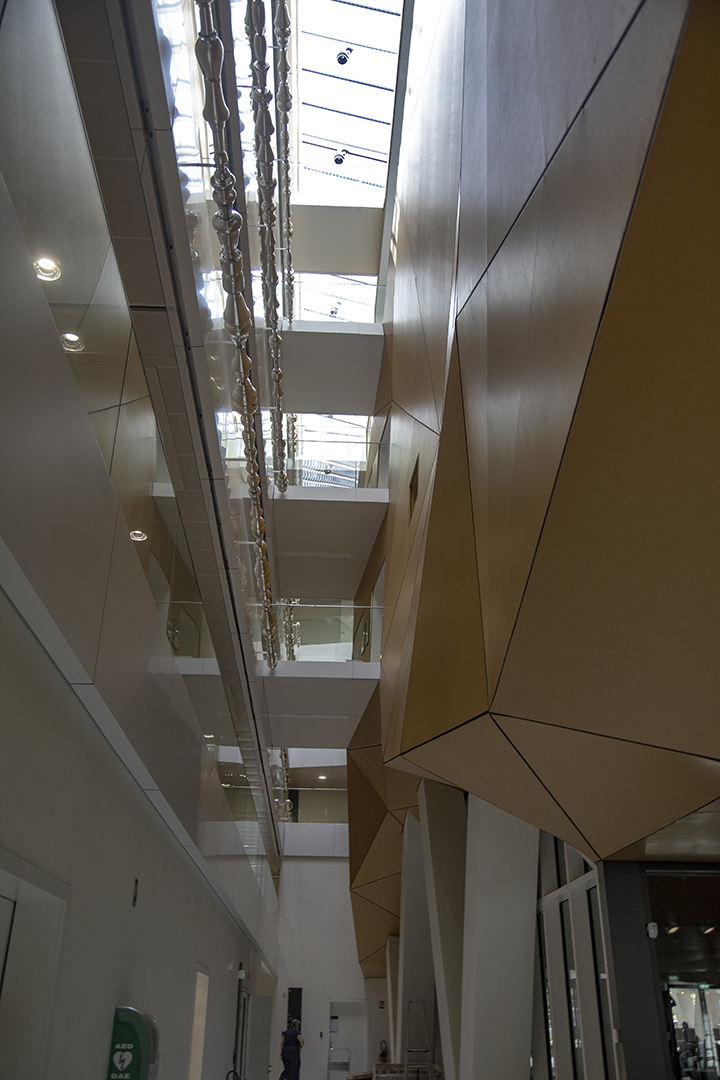 Verres, vases, chopes, soupières, carafes… 501 de ces contenants, à l’origine utilitaires, ont été assemblées pour habiller gracieusement, comme des guirlandes, les trois étages centraux du hall du Cardo. Transparence des passerelles et jeux de lumière se conjuguent pour offrir au visiteur une perspective prolongée sur le bâtiment. « C’est exactement l’effet que j’attendais », se félicite Christelle Familiari, l’artiste d’origine niortaise qui a conçu l’œuvre. Celle-ci dormait depuis cinq ans dans des cartons, la faute à des reports successifs du chantier.