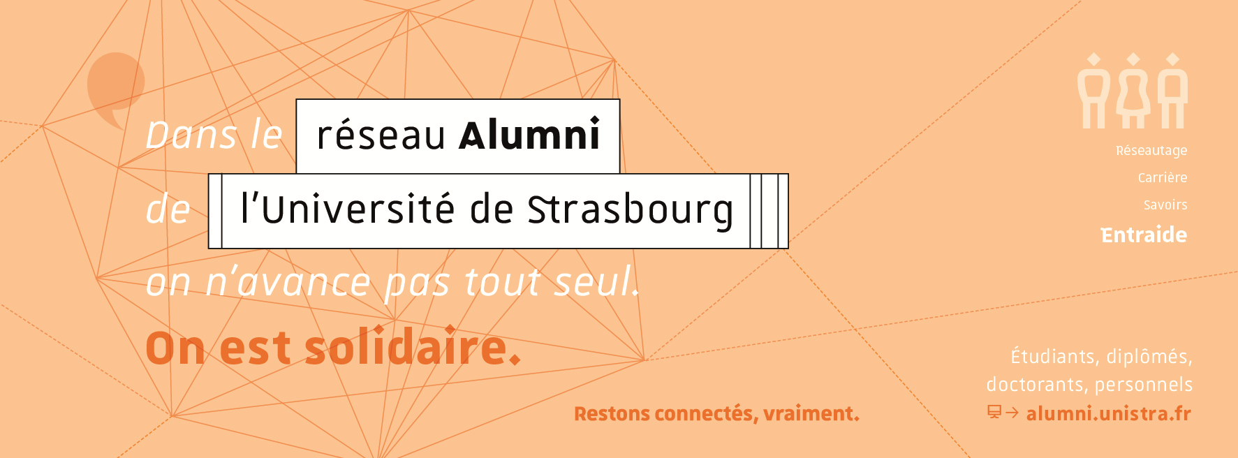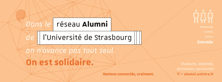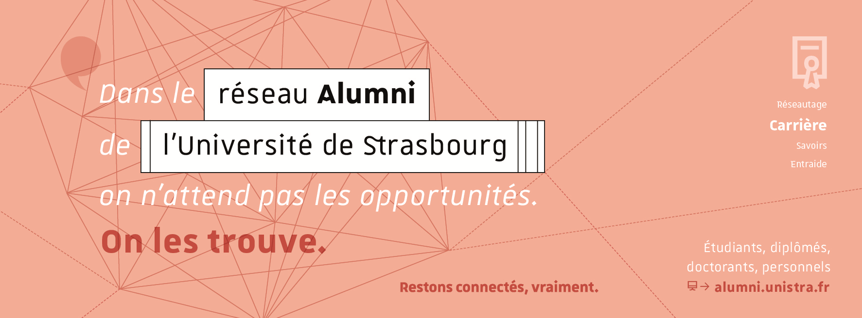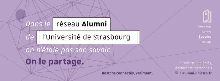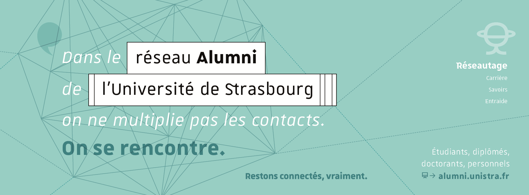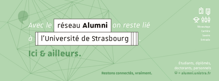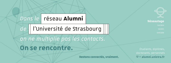 Vous êtes diplômé, doctorant, étudiant ou faites partie du personnel de l’Université de Strasbourg ou de l'une de ses trois anciennes universités (Louis Pasteur, Marc Bloch, Robert Schuman) ? Rejoignez le réseau Alumni de l'Unistra en vous inscrivant sur son réseau social professionnel à partir du site http://alumni.unistra.fr (accès gratuit).