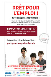 Du 8 au 23 novembre 2017, les étudiants et jeunes diplômés de l’Université de Strasbourg en recherche de stage ou d’emploi pourront s’entrainer lors de simulations d’entretiens de recrutement dans le cadre de l’opération « Prêt pour l’emploi » : face aux pros, pas d’impro !