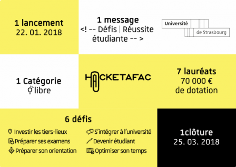 Les étudiants peuvent candidater seul ou en équipe. Une seule consigne : formaliser son projet à travers une présentation vidéo. La date limite de dépôt des projets est fixée au 25 mars. Jusqu’à 7 projets lauréats seront sélectionnés au cours du mois d’avril 2018 et se verront remettre chacun une enveloppe de 10 000 € pour financer la réalisation de leur projet d’ici le 31 décembre 2018. Le projet « Hacke Ta fac » pour la réussite étudiante permettra ainsi aux étudiants retenus de monter en compétences à travers l’utilisation du mode projet et, pour l’Université de Strasbourg, d’accélérer sa transformation numérique.