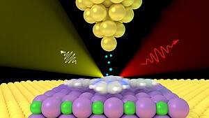 Les chercheurs ont utilisé la pointe effilée d’un microscope à effet tunnel pour imager et sonder une unique molécule de phtalocyanine, un pigment utilisé pour ses propriétés optiques et électroniques, séparée d’un substrat d’or par une fine couche de sel. La couche de sel permet de préserver les propriétés de fluorescence du pigment, autrement altérées par le contact direct avec le métal. Cette couche autorise également le passage d'un faible courant électrique allant de la pointe au substrat d'or au travers de la molécule. Dans ces conditions, les auteurs ont montré qu’il est possible de changer l’état d’oxydation de la molécule, en l’occurrence de la charger positivement, et de stabiliser cet état suffisamment longtemps pour en sonder ses propriétés de fluorescence. Ici, le courant électrique est également utilisé pour stimuler l’émission de lumière. Le spectre optique obtenu est caractéristique des transitions entre différents états électroniques de la molécule, qualifiés d’excité et de fondamental, mais révèle également la signature d’un grand nombre d’états vibrationnels propres à la molécule chargée, un signal qui n’avait jamais été détecté auparavant.