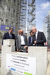 La pose de la 1re pierre du Studium, le 6 septembre 2018, est l’occasion pour l’Université de Strasbourg et l’ensemble des partenaires financeurs – l’État, la Région Grand Est, le Conseil départemental du Bas-Rhin et l’Eurométropole de Strasbourg – de saluer notamment ce projet architectural voulu comme un signal fort pour marquer l’une des entrées majeures du campus implanté en plein cœur de la ville de Strasbourg.