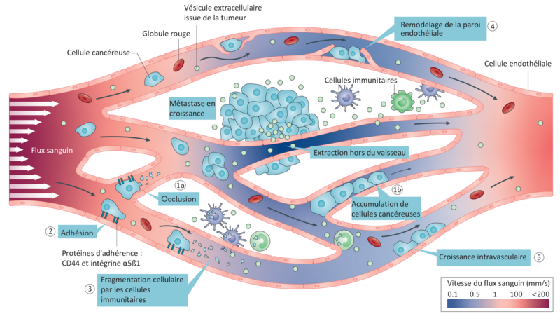 Les cellules tumorales circulantes utilisent les réseaux lymphatiques et sanguins pour se disséminer dans l’organisme et former des métastases à distance de la tumeur primaire. Jacky Goetz, chercheur Inserm, et son équipe Tumor biomechanics au sein du laboratoire Immunologie et rhumatologie moléculaire (Inserm/Université de Strasbourg) ont contribué à montrer que les propriétés des flux de ces liquides biologiques influent énormément sur le risque d’apparition de ces métastases. Ils ont notamment observé que le ralentissement du flux sanguin au niveau de la ramification des artères permettait aux cellules cancéreuses de s’accrocher à la paroi vasculaire et de s’extraire des vaisseaux pour aller coloniser les tissus. L’équipe de recherche fait le point sur ses travaux dans une revue de littérature publiée dans Nature Reviews Cancer.