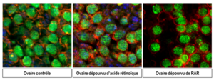 Pour clarifier le rôle de l’acide rétinoïque, des scientifiques niçois et strasbourgeois3 ont utilisé deux approches complémentaires. Dans la première, ils ont empêché la fabrication d’acide rétinoïque dans l’ovaire embryonnaire de souris. Dans la seconde, ils ont bloqué le message relayé par l’acide rétinoïque en invalidant ses récepteurs. Dans les deux cas, les cellules germinales initient la méiose normalement. Mieux encore, les ovocytes dépourvus de récepteurs de l’acide rétinoïque donnent naissance, après fécondation, à des souriceaux viables, preuve que leur fonctionnalité n’est pas altérée.