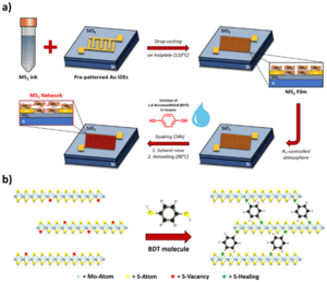 Les chercheurs de Strasbourg, Dublin et Cambridge ont fait un grand pas en avant en développant une stratégie de fonctionnalisation moléculaire afin de surmonter ces limitations. L’idée est simple mais efficace : utiliser de petites molécules pour simultanément « réparer » les défauts du matériau générés lors de l’exfoliation et ponter des feuillets voisins. De cette façon, la structure cristalline du TMD est restaurée et le transport de charge à travers le réseau interconnecté de manière covalente est amélioré, conduisant à des dispositifs électroniques (par exemple des transistors à couche mince) avec des performances électriques, une stabilité à l’eau et une robustesse mécanique supérieures.