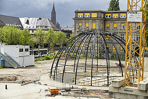 Les travaux de construction du planétarium de l’Université de Strasbourg se poursuivent avec la pose, depuis le début du mois de mai 2021, d’un élément central du chantier : le dôme. Le nouveau planétarium ouvrira ses portes fin 2022. Il figure parmi les projets phares de l’université, qui est la seule en France à exploiter ce type d’équipement. Il s’inscrit dans le vaste programme de l’Opération Campus et comprendra l’accueil général du Jardin des sciences, la nouvelle salle du planétarium – le théâtre cosmique – ainsi qu’un jardin ouvert au public.