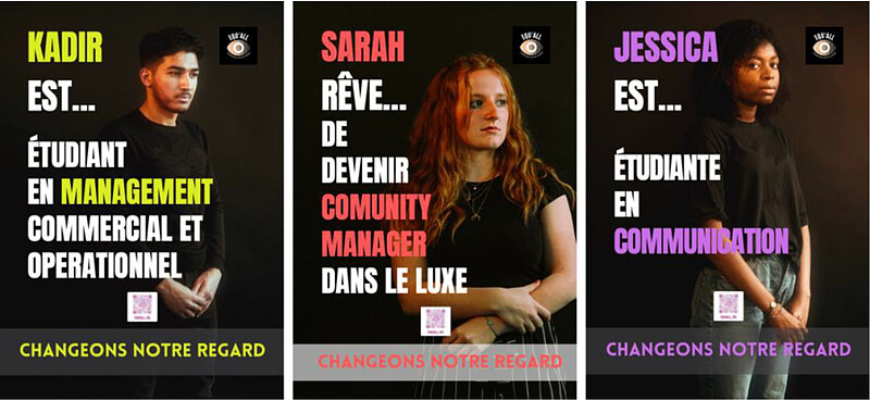 Fondant leur réflexion sur l’analyse de nombreuses campagnes menées par diverses organisations, les étudiant•es ont ainsi décidé d’inviter leurs pairs à interroger la façon des stéréotypes peuvent brouiller l’impression laissée par une première rencontre ou une première image. Dans leur campagne intitulée EQU’ALL qui cible les étudiant•es de l’université, et plus généralement les jeunes à Strasbourg, ils et elles ont choisi de s’attaquer au racisme ordinaire et à la parole blessante. Se prêtant pour quelques-un•es à une séance photo réalisée par un photographe ou en empruntant d’autres images, ils et elles ont ainsi conçu une série d’affiches rappelant que tous les jeunes partagent des objectifs et des rêves communs. Ces posters ont été exposés à travers la ville, en particulier sur les campus d’Illkirch et Esplanade de l’Université de Strasbourg et sur les réseaux sociaux.