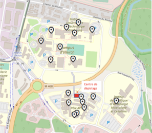 A partir du 16 septembre 2021, un centre de dépistage (Algeco) sera installé à l'arrière du Bâtiment POLE API (300 Bd Sébastien Brant, 67400 Illkirch-Graffenstaden). Idéalement situé, il se trouve sur le trajet des étudiants se rendant ou sortant de la faculté et/ou du restaurant CROUS. Il sera accessible de 10h à 17h du lundi au vendredi. Les étudiants pourront venir directement ou prendre rendez-vous sur Doctolib.