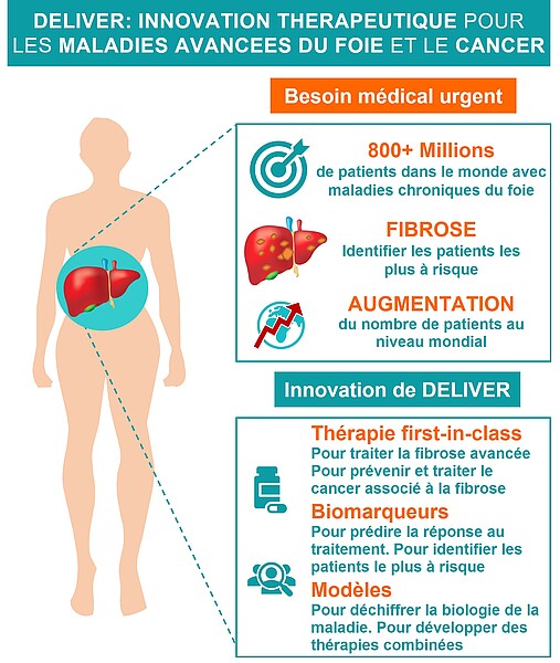 DELIVER a l’ambition d’améliorer la prise en charge des patients souffrant d’une maladie hépatique avancée, en proposant une nouvelle approche thérapeutique et des biomarqueurs non invasifs pour identifier les patients à risque de voir leur maladie hépatique évoluer vers un cancer. Pour relever ce défi majeur, des équipes multidisciplinaires de classe mondiale, issues des secteurs public et privé, unissent leurs forces : des experts en recherche translationnelle sur les maladies du foie de l'Inserm, de l'Université de Strasbourg, de l'IHU de Strasbourg, des Hôpitaux Universitaires de Strasbourg, de l'AP-HP Bobigny et de l'Université Sorbonne Paris Nord, travailleront ensemble avec la société de biotechnologie franco-suisse Alentis, étoile montante du développement pharmaceutique dans le domaine, et le leader de l'imagerie médicale Guerbet. DELIVER est le résultat d'une synergie de longue date en matière de recherche translationnelle et de transfert de technologie entre trois entités du Programme d'Investissement d'Avenir (LabEx HepSYS, IHU Strasbourg et SATT Conectus).