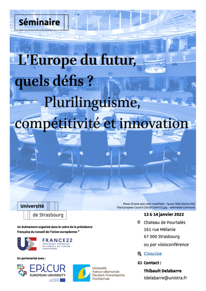 Les 13 et 14 janvier, l’Université de Strasbourg en partenariat avec l’Université franco allemande et l’alliance EPICUR organisent le séminaire « L’Europe du futur, quels défis ? Plurilinguisme, compétitivité et innovation » au Château de Pourtalès à Strasbourg. Cet événement fait partie des actions labellisées par la présidence française du Conseil de l’Union européenne*. Ces échanges visent à apporter un éclairage nouveau sur de multiples enjeux européens. Ce cycle de conférences sera également diffusé en ligne.