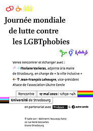 L’Université de Strasbourg, sous l’égide de sa Mission égalité parité diversité, en lien avec l’Eurométropole de Strasbourg et l’association l’Autre Cercle organise une rencontre contre les LGBTphobies le mardi 17 mai. Cette rencontre se tiendra dès 12h30 au Nouveau Patio en présence de Floriane Varieras, adjointe à la maire de Strasbourg en charge de la « Ville inclusive ».