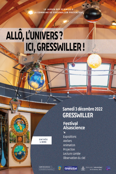 Le samedi 3 décembre, le Jardin des sciences de l’Université de Strasbourg et la commune de Gresswiller proposent au grand public de participer à l’Alsascience « Allô, l’Univers ? Ici, Gresswiller ! » : un festival de culture scientifique autour de l’astronomie.