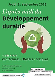L'IUT Louis Pasteur de l’Université de Strasbourg organise un après-midi dédié au développement durable à destination de l'ensemble des étudiants de première année le jeudi 21 septembre, de 13h30 à 18h. Au programme : conférences, ateliers et fresques.