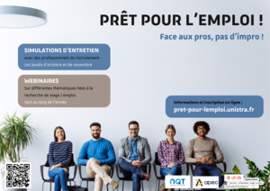 L’opération « Prêt pour l’emploi ! » a pour objectif de préparer les étudiants à des simulations d'entretien en présentiel tous les jeudis d'octobre et de novembre. Des professionnels des ressources humaines et des personnels de l'Université de Strasbourg se mobilisent pour apporter des conseils utiles à la préparation d’entretiens d'embauche du 4 octobre au 30 novembre 2023. En parallèle, des ateliers en ligne sur différentes thématiques liées à la recherche de stage / emploi seront proposés tout au long du semestre.