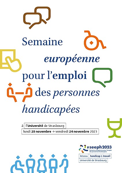 « Dans le cadre de l'édition 2023 de la semaine européenne pour l’emploi des personnes handicapées, l’Université de Strasbourg organise plusieurs événements d’information, de sensibilisation et de prévention qui se dérouleront sur les différents campus du 20 au 24 novembre 2023. Différents formats ont été imaginés : ateliers d’accessibilité numérique, table ronde, expériences immersives et sensorielles, jeux et formations. L'objectif principal est de contribuer à faire évoluer les représentations de chacun sur le handicap en amenant chacun à poser un regard différent sur le quotidien d’une personne en situation de handicap au travail. Il s’agit également d’apporter des réponses à diverses questions en lien avec une situation éventuelle de handicap, notamment en termes d’accompagnement proposé par l’université. »
