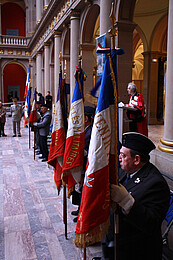25 novembre 1943 de l’Université de Strasbourg exilée à Clermont- Ferrand, en présence d’Alain Beretz, président de l’université de Strasbourg, Armande Le Pellec Muller, recteur de l’académie de Strasbourg, chancelier des Universités d’Alsace, Stéphane Bouillon, préfet de la Région Alsace, préfet du Bas-Rhin et de Daniel Bloch, fils du professeur Marc Bloch.