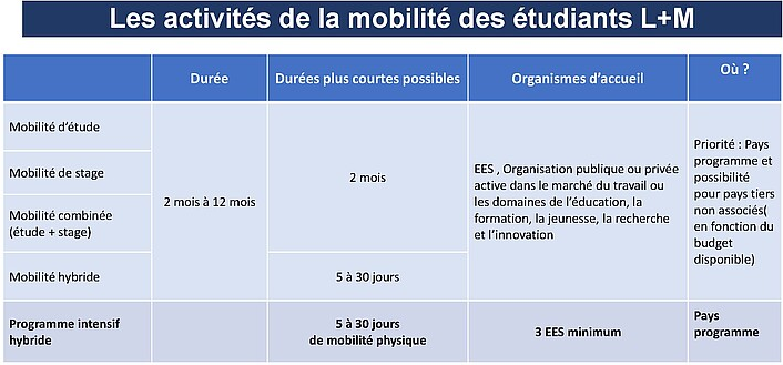 La durée maximale de mobilité physique par cycle (Licence, Master, Doctorat) est de 12 mois, qui peuvent être scindés en plusieurs mobilités, à condition de respecter pour chaque mobilité la durée minimale éligible.