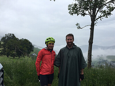 Le temps fort du jour, l’ascension, débute sous une bruine qui semble désespérément accrochée aux contreforts de la montagne. Les cyclistes s’égrènent sur les pentes et émergent de la brume au gré des lacets. Sur les derniers kilomètres c’est une pluie battante qui fouette le visage et détrempe les vêtements. Aussi longue soit-elle, l’ascension est réussie par tous et l’accueil chaleureux au sommet compense les éléments hostiles (froid, pluie).